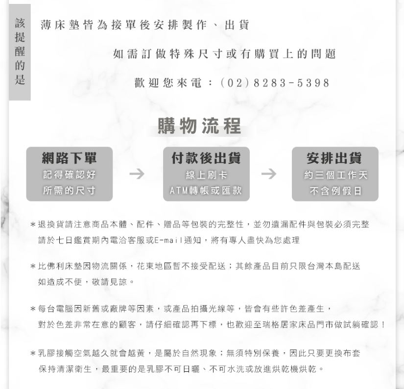 貼心提醒 : 因系統一貫作業且為符合臺灣物流倉配貨時效,請您結帳前務必確認訂單內容,恕未能中斷流程為您加購商品、變更尺寸、拆並定單和更改付款方式之服務,也避免有耽誤統一配貨的狀況噢! 如您的訂單需要取消,請於訂單狀態顯示”未處理”之前,線上可點選『我要取消』後再重新下單即可。(但若重新訂購時商品的庫存及價格有異,將會以當時網頁訂購時所顯示的資訊為準。)