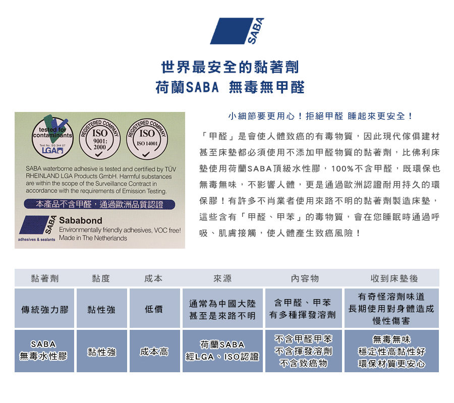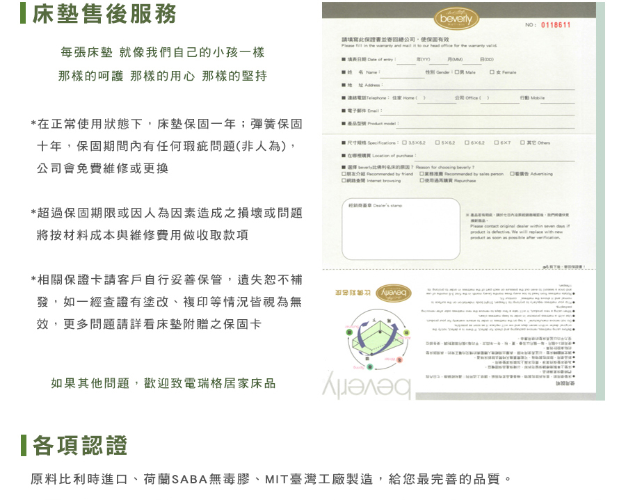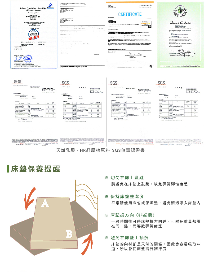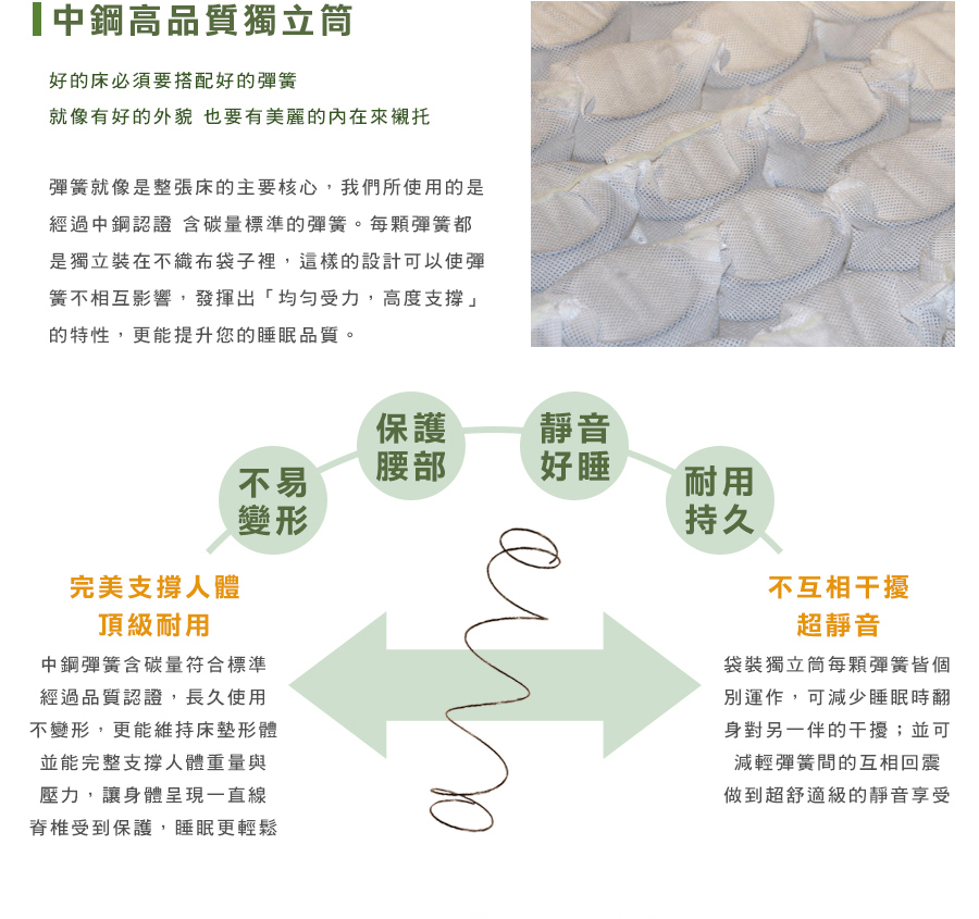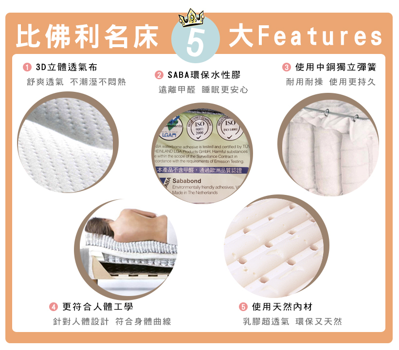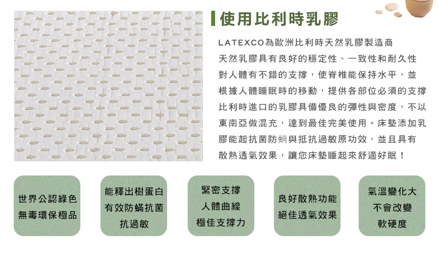 床墊內部添加歐洲進口Latexco天然乳膠及高密度環保棉,使人體能享受到乳膠的天然Q度增加腰部支撐及彈力。