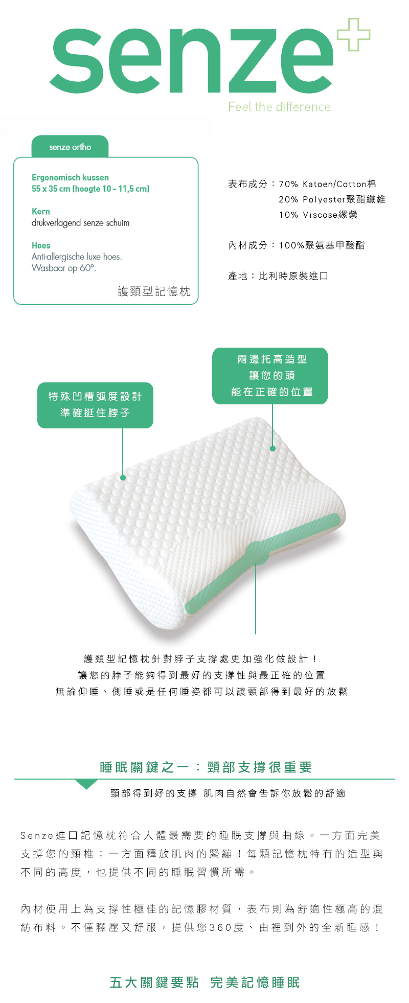 規格 : L55 * W35 * H12~8 cm 網路價 : NT$ 6,000 表布材質 70% Katoen/Cotton棉 20% Polyester聚酯纖維 10% Viscose縲縈 核心內材 100% 聚氨基甲酸酯 製造地 比利時原裝進口